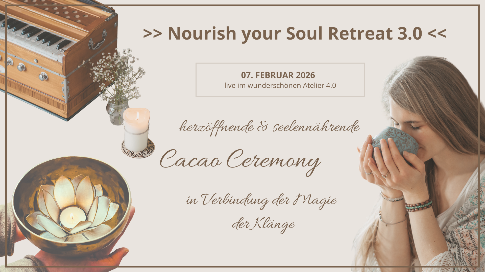 NOURISH YOUR SOUL RETREAT 07.02.2026 – Herzöffnende Cacao Ceremony in Verbindung mit Klangmagie im wunderschönen Atelier 4.0